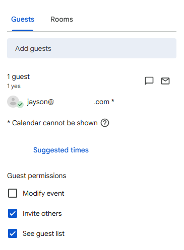(By using your email instead of your customer’s it allows you to add their email address after the appointment is scheduled. If you use their email address than you won’t have the opportunity to get the booking link.) - After you receive the calendar invite, edit the calendar invite in your own Google Calendar and add your customer’s email address in the “Add guests” field–then save the event.