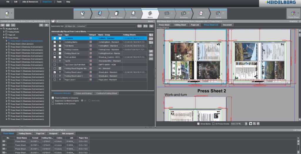 19×25 press sheets. We utilized small take-o bars on the tail of the sheet to balance the inking of the sheet better as well as collating, side lay, folding, color control, and trim marks to
